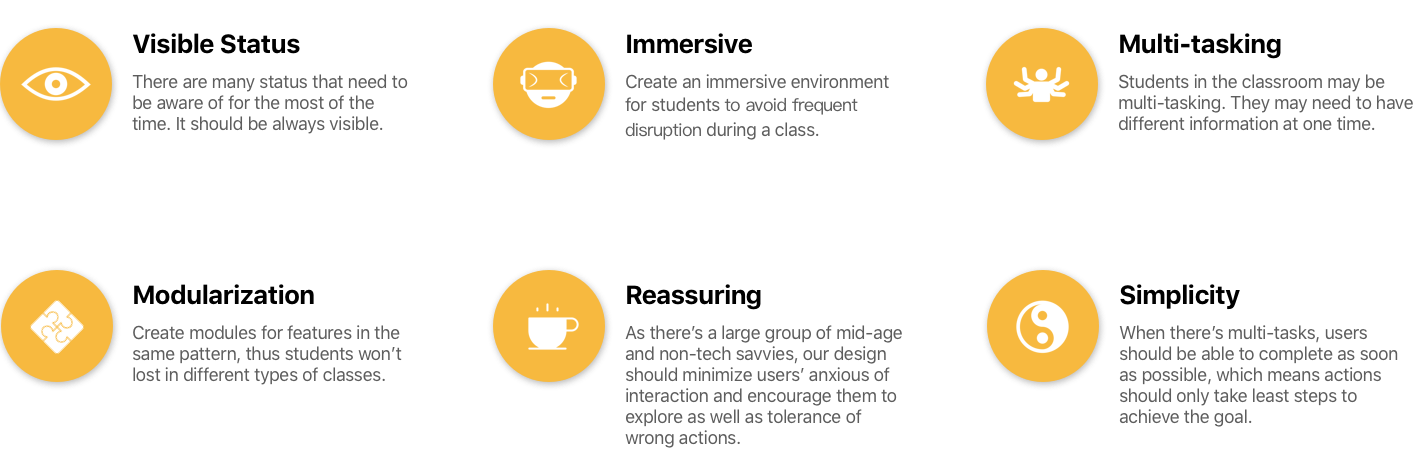 Inherited from previous core interaction, users can tap on the screen to call more actions. The status are notably enlarged and some icons now can be tapped to change the state. At the bottom, user can type text to send messages and also check other student's’ status. At the right side, user can call out the notes panel. Instead of having note panel only as previous design, we could utilize the space to display both slide and notes.